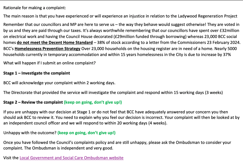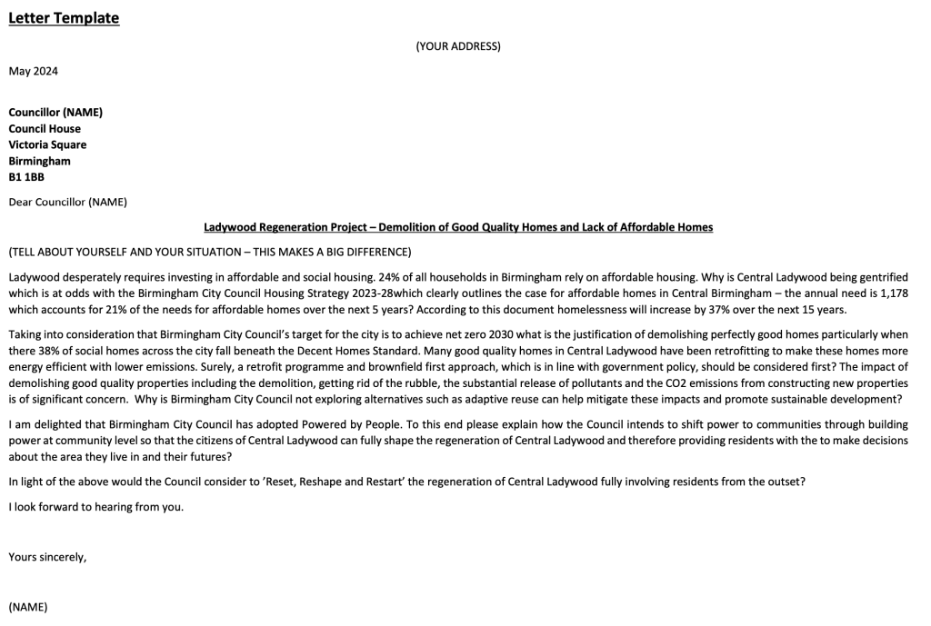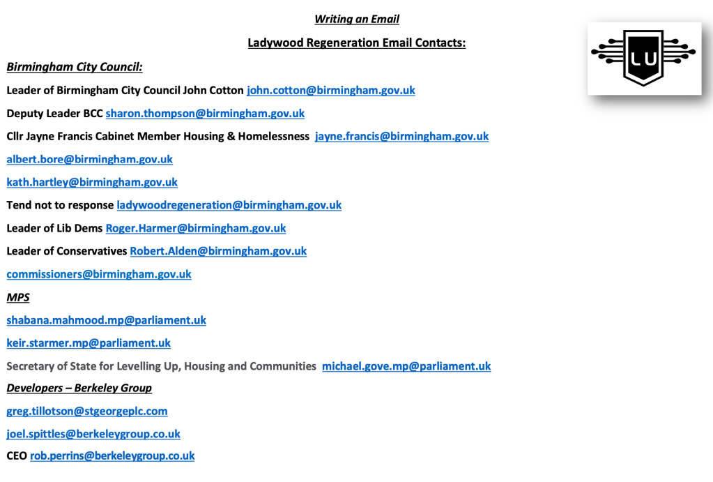 Tend not to response ladywoodregeneration@birmingham.gov.uk