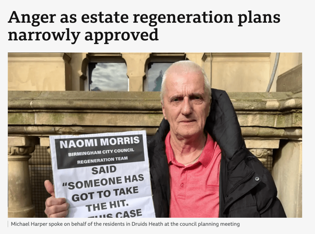 As a result of the vote today the whole of the original Druids Heath estate will be demolished and only 400 affordable homes will be built. We are concerned that the pensioners and homeowners will end up taking the hit as Birmingham City Council Regeneration Team Officer Naomi Morris said they would on 3 December 2024, as well as the lack of social homes for existing council tenants.