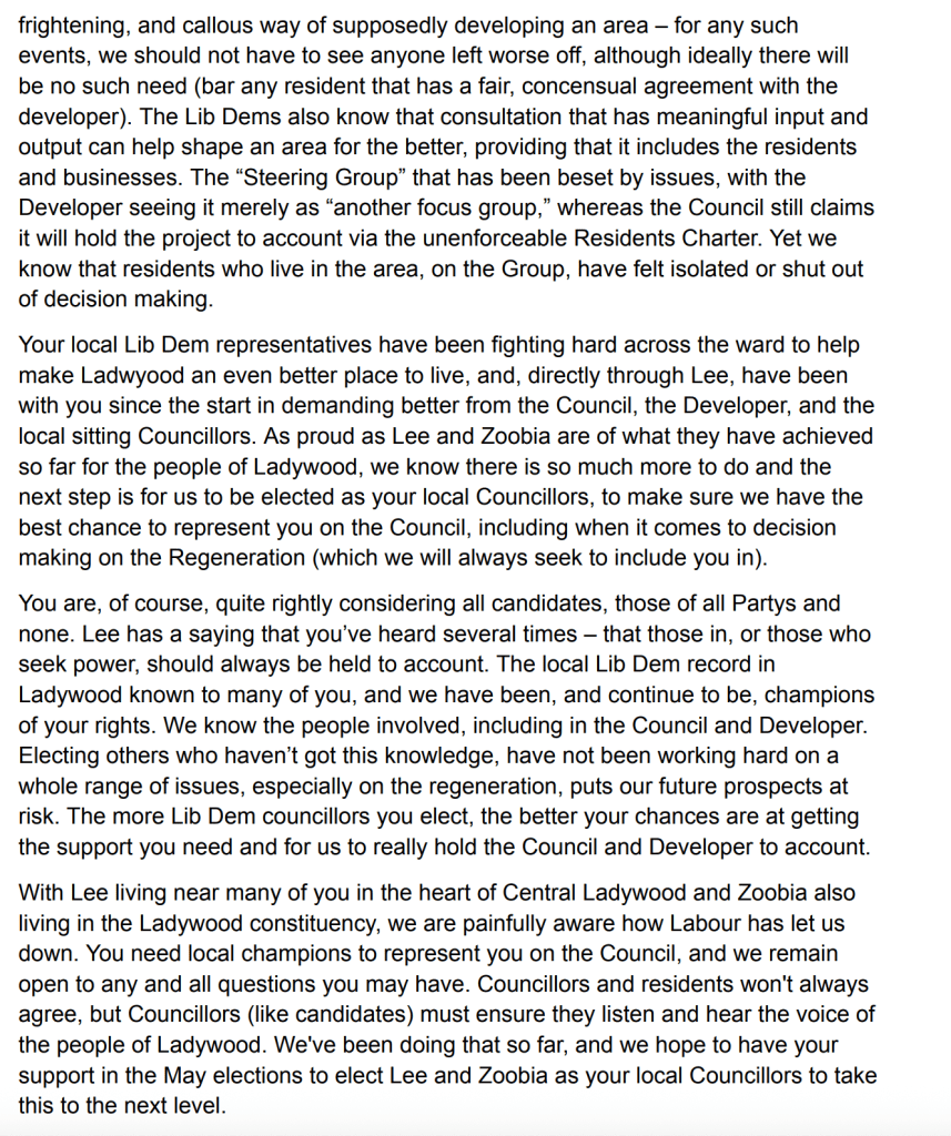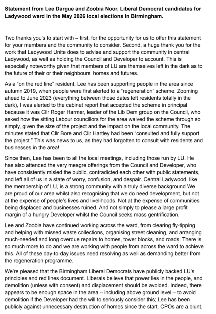 Ladywood Liberal Democract Election Statement – Local 2026 Election – Lee Dargue and Zoobia Noor