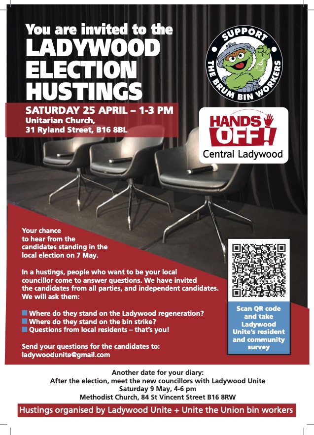 Ladywood Unite have partnered with Unite the Union Bin Workers to hold a joint ‘hustings’ – where you can meet the candidates running for election and ask them questions.